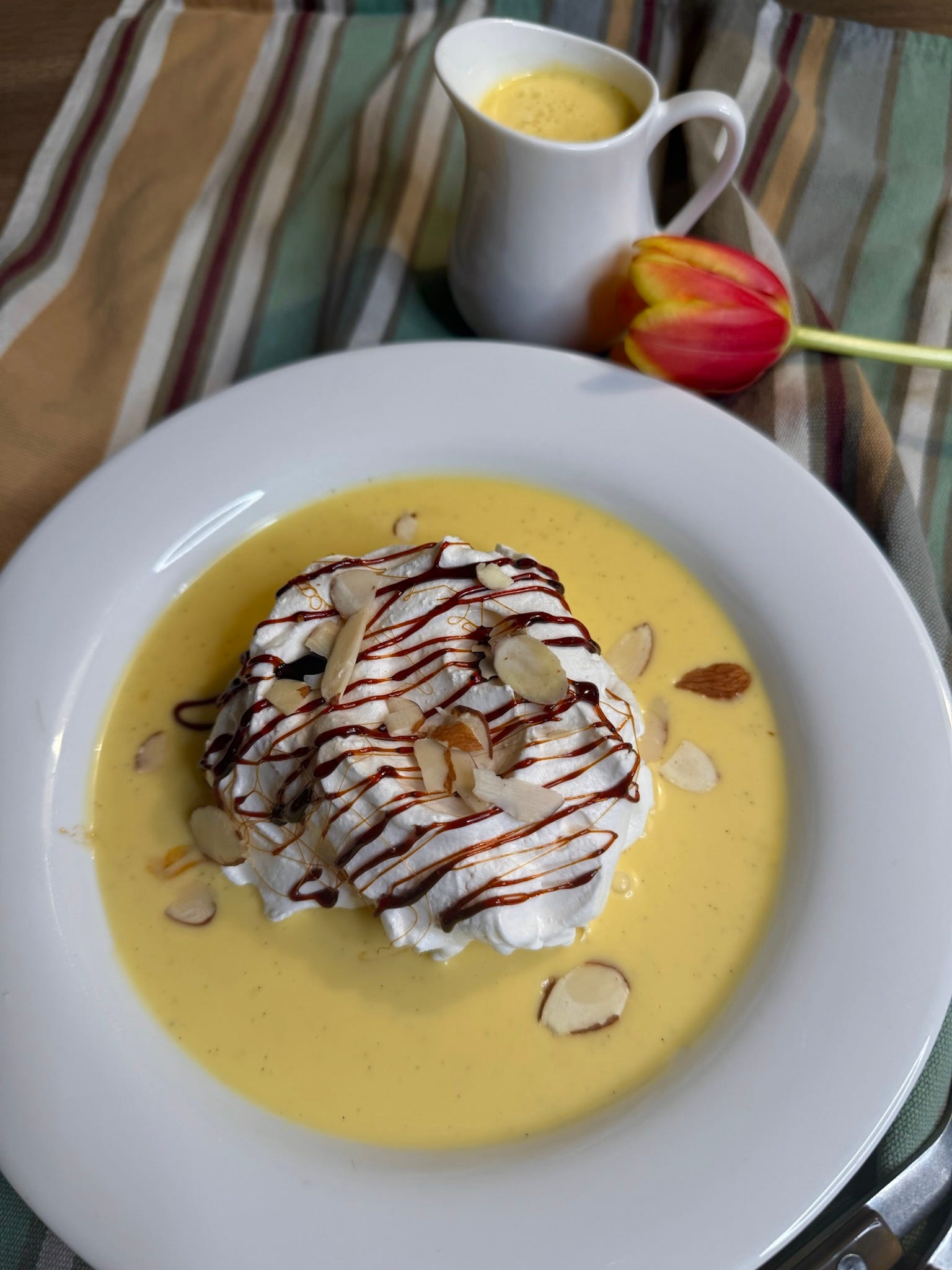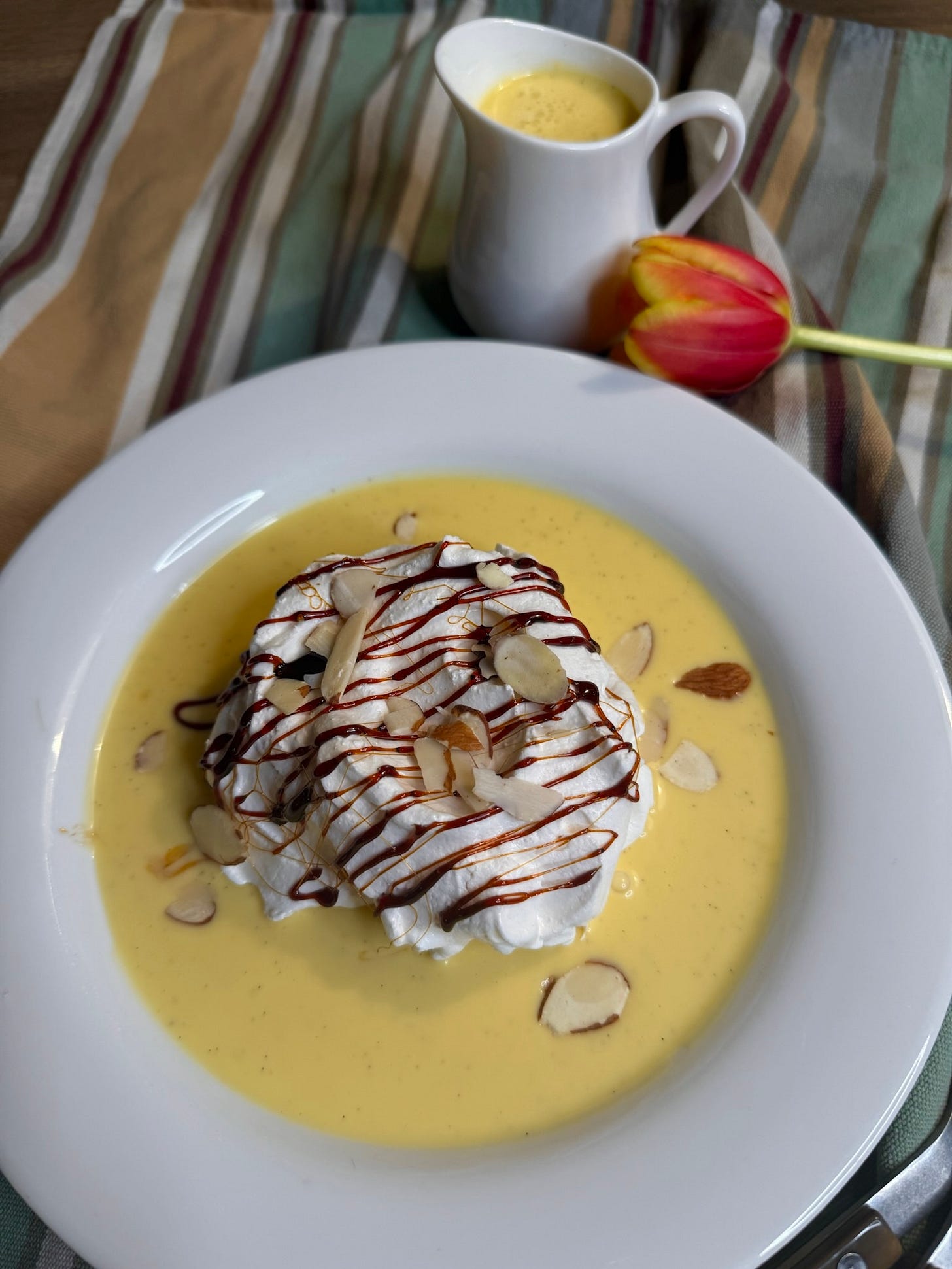 Such a ubiquitous French dessert, I’ve always avoided making this, mostly because I didn’t like the meringue poaching process. Recently I saw a recipe in the WSJ where the meringue is baked rather than poached. What a great idea! Why didn’t I think of that? For me, it’s 90% about the crème anglaise anyway, which I just want to drink like a beverage.