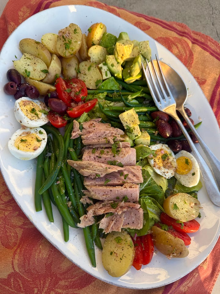 Arrange ingredients on your serving platter. I like to start with salad greens underneath and a little to one side. Then fan out the green beans and potatoes. Tomatoes next, and eggs. Think of it as a color wheel, separating the different colors for maximum effect. Finish with olives and avocado. Drizzle about ¼ cup (or more) vinaigrette over the salad. Sprinkle on some flaky salt, a few grindings of black pepper, and the chopped herbs to garnish.